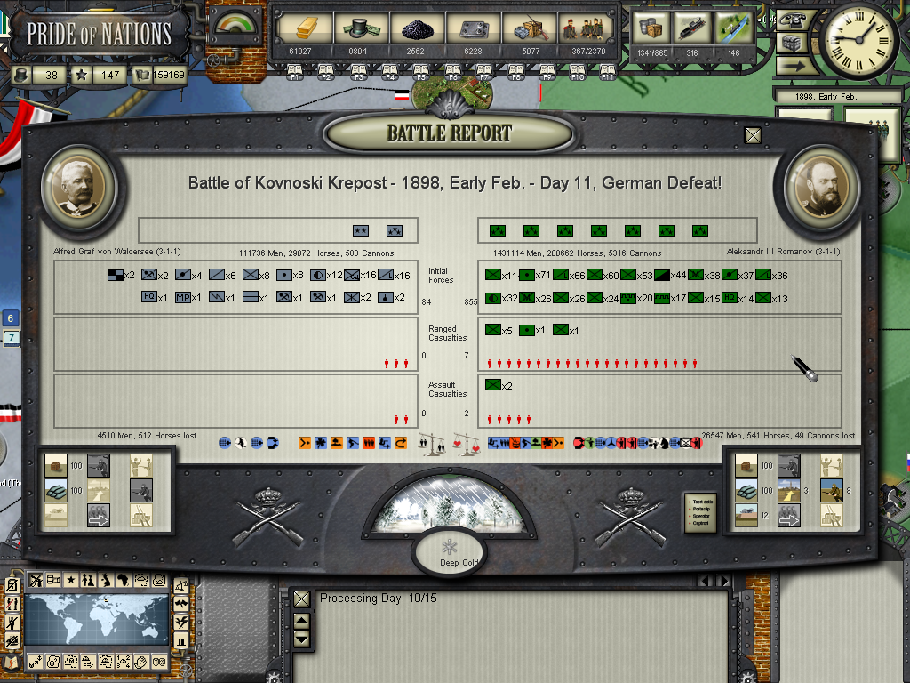 HerrDan wrote:Thank you for the advice, I didn't know it was a good idea to create big and "inneficient" stacks as a player it's goood to know that it's not that bad, again I'm not that experienced with great wars in PON, I still have a lot to learn to take advantage ot some situations like the ones you mentioned, again the territory we're tighting doesn't help much in regard to take advantage of it against them. Oh and yes, I'm inflicting very heavy losses on them and it's kind of make me feel less scared, the rate of losses is about 1 man to 5 or so in my favor, so if my army continues to perform this good the odds are not that bad for me (again very realistical as this was always more or less the case in real history conflicts between Germany and Russia as well.)![]()
