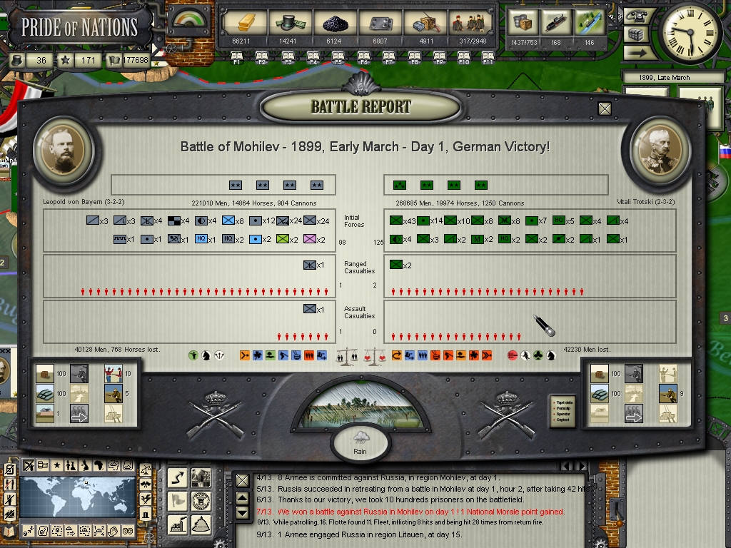 as to the war on land, mostly going in your favour but you don't want too many victories like Mohilev or you'll be badly weakened by attrition