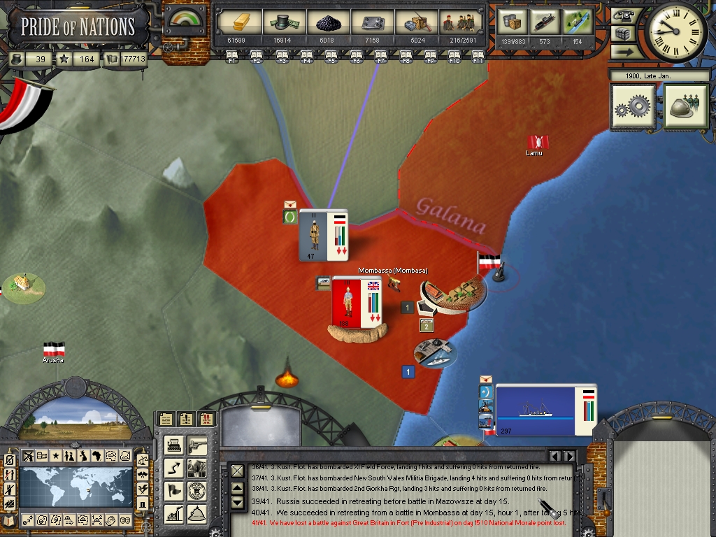 The war with the british was unexpected, a crisis emerged and I chose to let the ai play the crisis cards for me, and the crisis went out of control, anyway Loki commented that by looking at the crisis intensity at the start of the crisis (87) it would be very hard to avoid war. The british are giving me a lot of headache, they have a powerful navy and they are wrecking havoc in my merchant fleet everywhere, besides I'm finding it very dificult to fight them in our colonies around the world. It's a great challenge to fight them, Italy and Austria didn't move a straw to help me until now, but anyway there's little Austria can do to help me, as they don't have oversea territories and their navy isn't nearly enough powerful to threat the british anywhere, but Italy could give us a hand in the mediterranean sea...