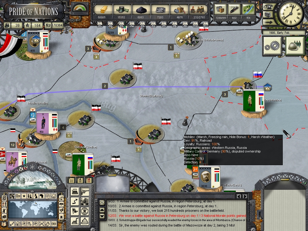Bronsart von Schllendorf captured Helsinki from the russians, what greatly boosted the support for Germany there. We have breached the fortifications of Saint Petersburg, our soldiers eagerly awaits the order for the assault! The war finally seems to be coming to an end.