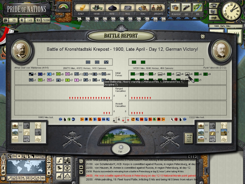 We have commited Marshal Waldersee against the russian forces in Saint Petersburg, as with the situation deteriorating against the british we need to force the russians into submission the faster way possible, Waldersee's forces met some resistance when advancing into the territory lost to the russians in the Battle of Saint Petersburg, the russians tried to hold the positions they obtained from the battle, but in the end they couldn't resist the thrust of the third army with our most experienced troops. So we're now again besieging Saint Petersburg, while our marine forces coming from Finland under Bronsart von Schlleffendorf captured several strong positions in Viborg, further isolating the russian capital.