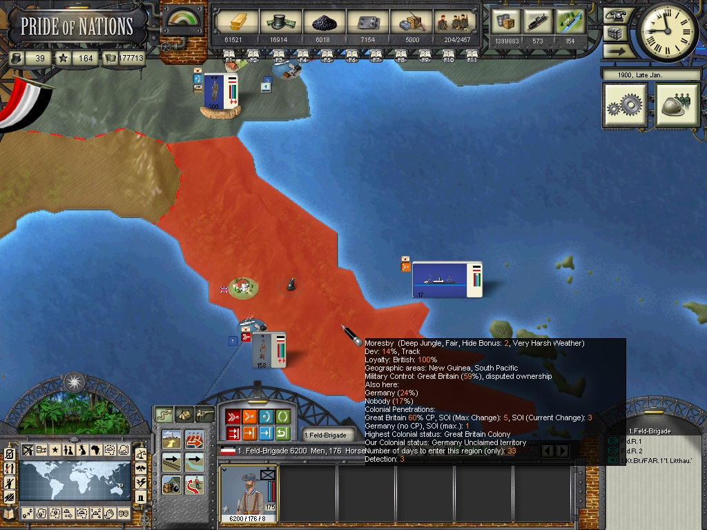The war with the british was unexpected, a crisis emerged and I chose to let the ai play the crisis cards for me, and the crisis went out of control, anyway Loki commented that by looking at the crisis intensity at the start of the crisis (87) it would be very hard to avoid war. The british are giving me a lot of headache, they have a powerful navy and they are wrecking havoc in my merchant fleet everywhere, besides I'm finding it very dificult to fight them in our colonies around the world. It's a great challenge to fight them, Italy and Austria didn't move a straw to help me until now, but anyway there's little Austria can do to help me, as they don't have oversea territories and their navy isn't nearly enough powerful to threat the british anywhere, but Italy could give us a hand in the mediterranean sea...