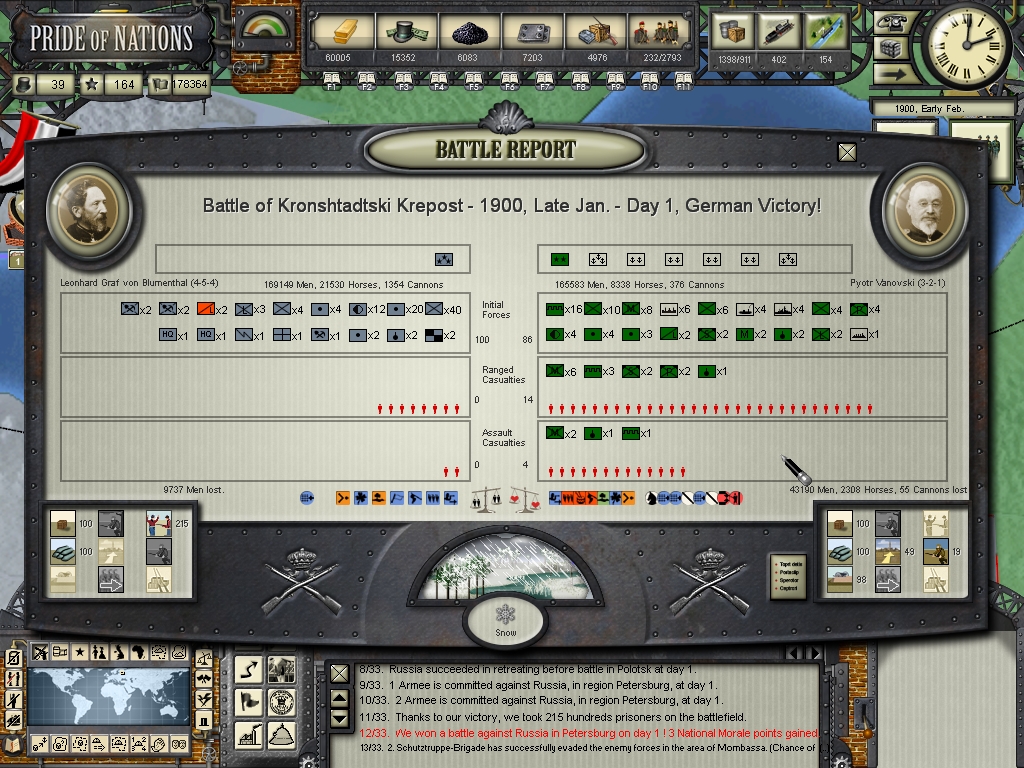 The winter in Russia has come prematurely this year, this is trully bad news, Saint Petersburg is in sight, but the last thing we want now is to give the russians time to rebuild their forces, and a harsh weather could force us to do that. We have suffered heavy losses in two failed attempts to assault the russian fortifications in Minsk, their forces are deeply entrenched there and the weather doesn't help.