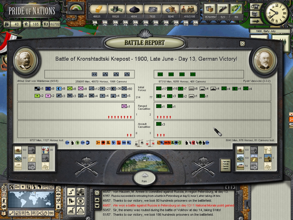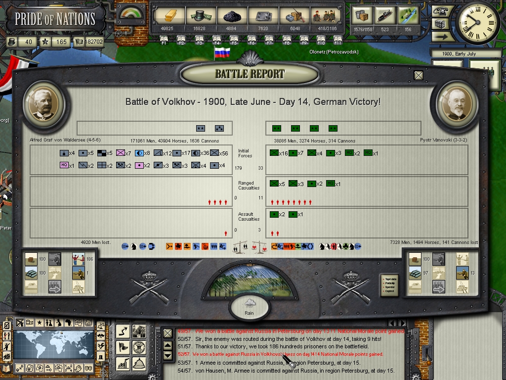 Unfortunately I think I can't use my last reserves in Germany in such a gamble into Great Britain, if I did so the french could be convinced that they could invade Germany, and I would definitely colapse if the french enter this war, this war is really stretching me (sometimes even mentally as a player :bonk :) to the limit, although I can say that at least the russians have no more backbone to resist throughout this Summer, the war in Russia will be over within a month or so, they cannot hold anymore, their armies are in a pitful situation, only militias and partisans, they surprised us in our failed assault against Saint Petersburg, but then again it was only because they were fighing inside that huge fortification complex and I commited the mistake in trusting an assault could force them to surrender, but outside their "walls" their forces are in a really deplorable condition.