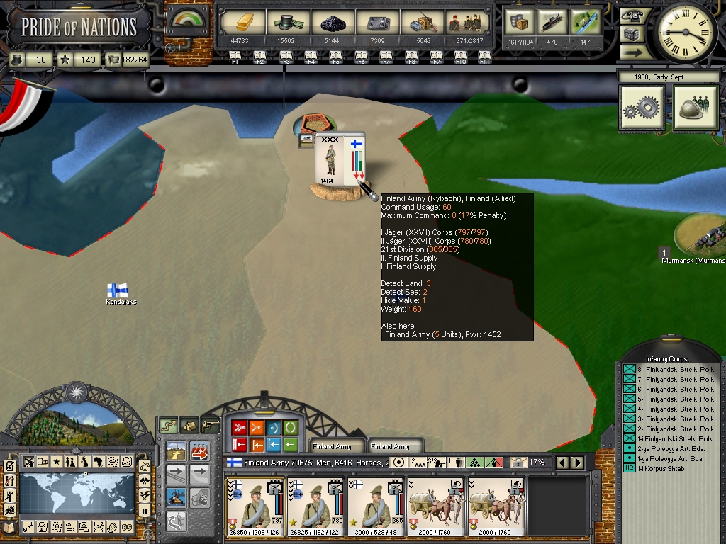 The Finnish army was created, twice as well, because I made the event fire for a second time as I explained above, it's not a big deal, I just ended up making the finns stronger, but the strange thing is that the army was created in Rybachi and not in Helsinki (Helsingors), I used the OOB_1914 files as a guideline when creating these troops, but I guess they should be created in the finnish capital and not in Rybachi.