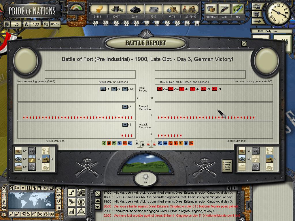 Despite our soldier's brave resistance, our garrison in Qingdao has surrendered after suffering heavy losses. This defeat will probably do much to booster the british morale in this war, we don't have any hope of sending soldiers to recapture Qingdao as this is really beyond our supply line's capacity. I hope that at least with a good victory in Africa we can somehow offset the loss of Qingdao and end this war in a good position.