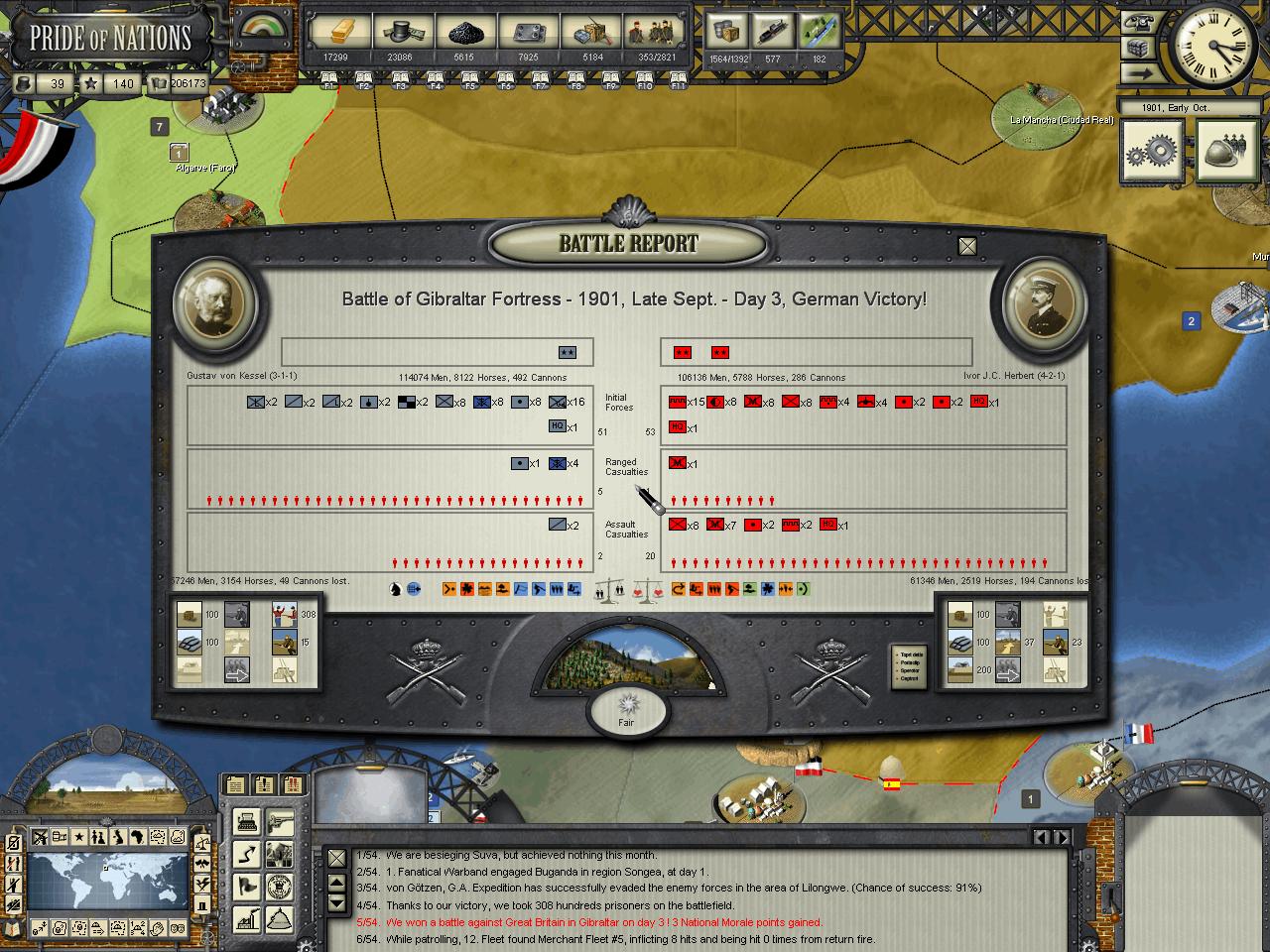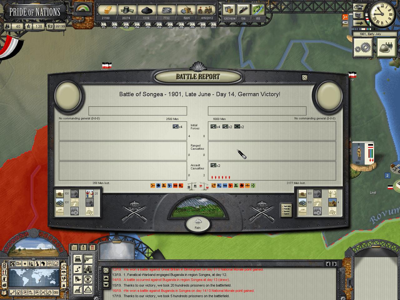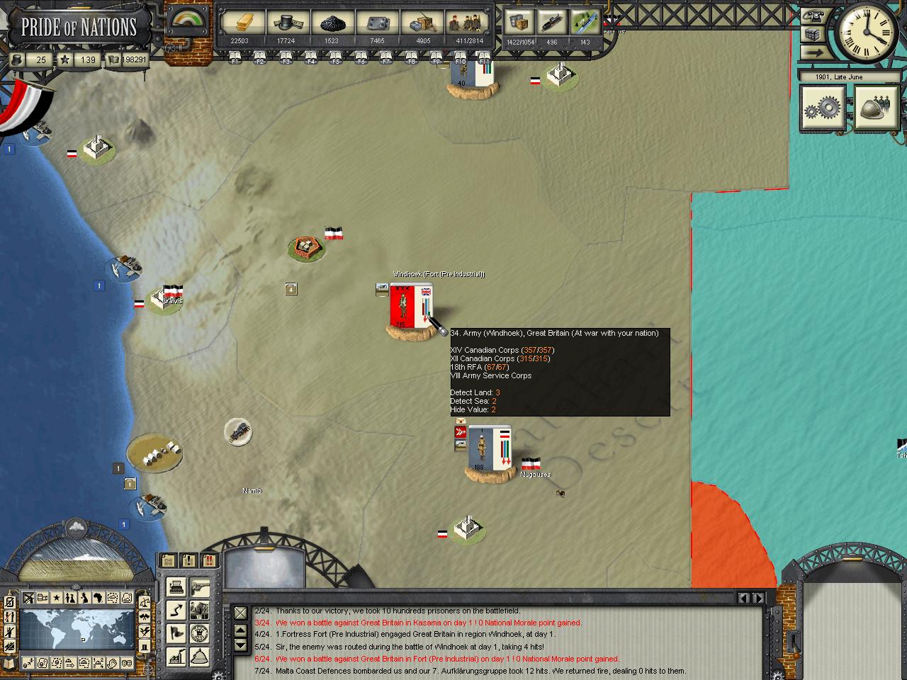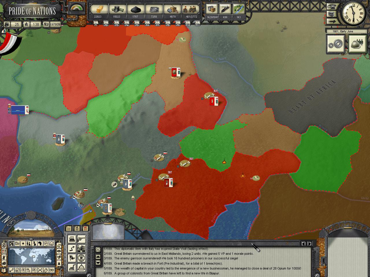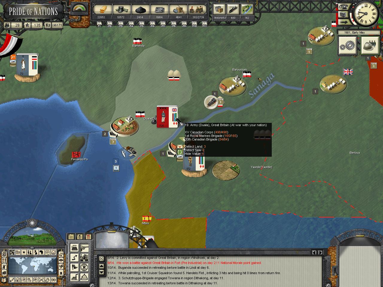 Kensai wrote:HerrDan, could you post some images of the map "zoomed out" (MC filter) so we can have an understanding of who owns what in Africa at the moment? I think your situation is not that critical, but you may need to focus on one-two colonies at a time. The British AI, in my experience, tends to move around troops around theaters in very strange ways. By later stages of the game I tend to find Canadian troops in India, Indian troops in Africa, etc. The AI moves troops around a lot, sometime disregarding the potential inherent penalties some guys can have when they fight out of their locales.