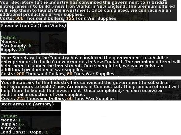 Gray Fox wrote:FYI, as this pic shows, an iron works costs $100 and 25 WS, while an armory costs either $25 or $33 and 6 to 9 WS each. So an iron work won't start making money for you until 100 turns have passed, whereas an armoury will start earning cash over and above its initial cost after about a year. You're better off building Ocean Transports and using them in the Atlantic sealane box to boost imports.