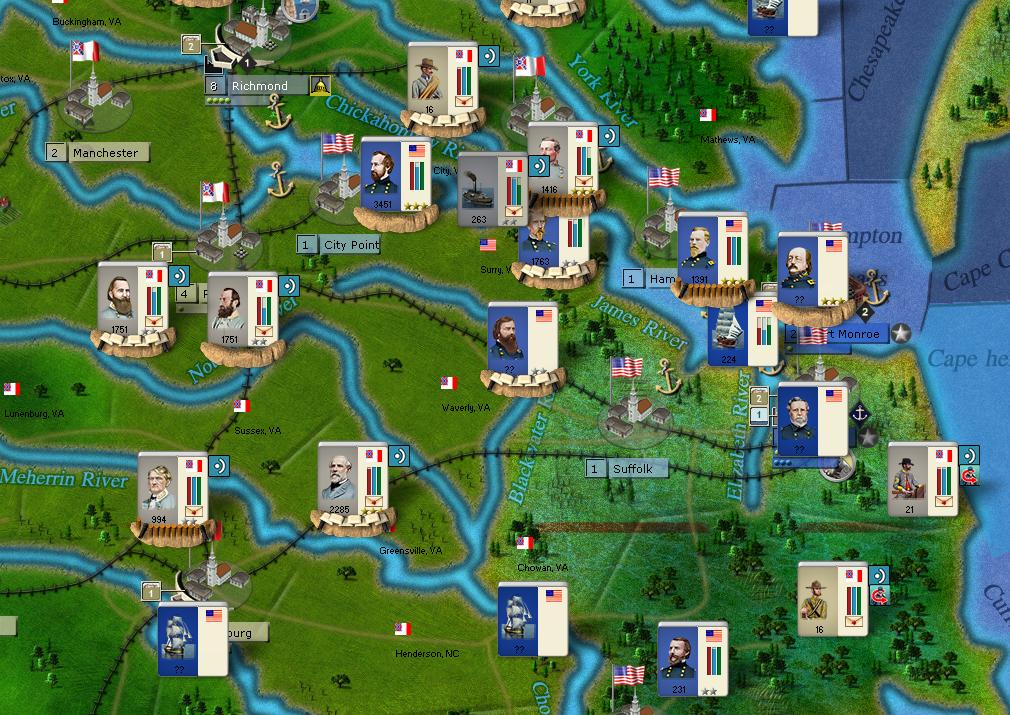 Indeed, City Point is a weak point and I was already thinking to it yesterday evening. By moving some forces out of James City, GrayFox allows me to take a division from Beauregard's army and I have another division available.