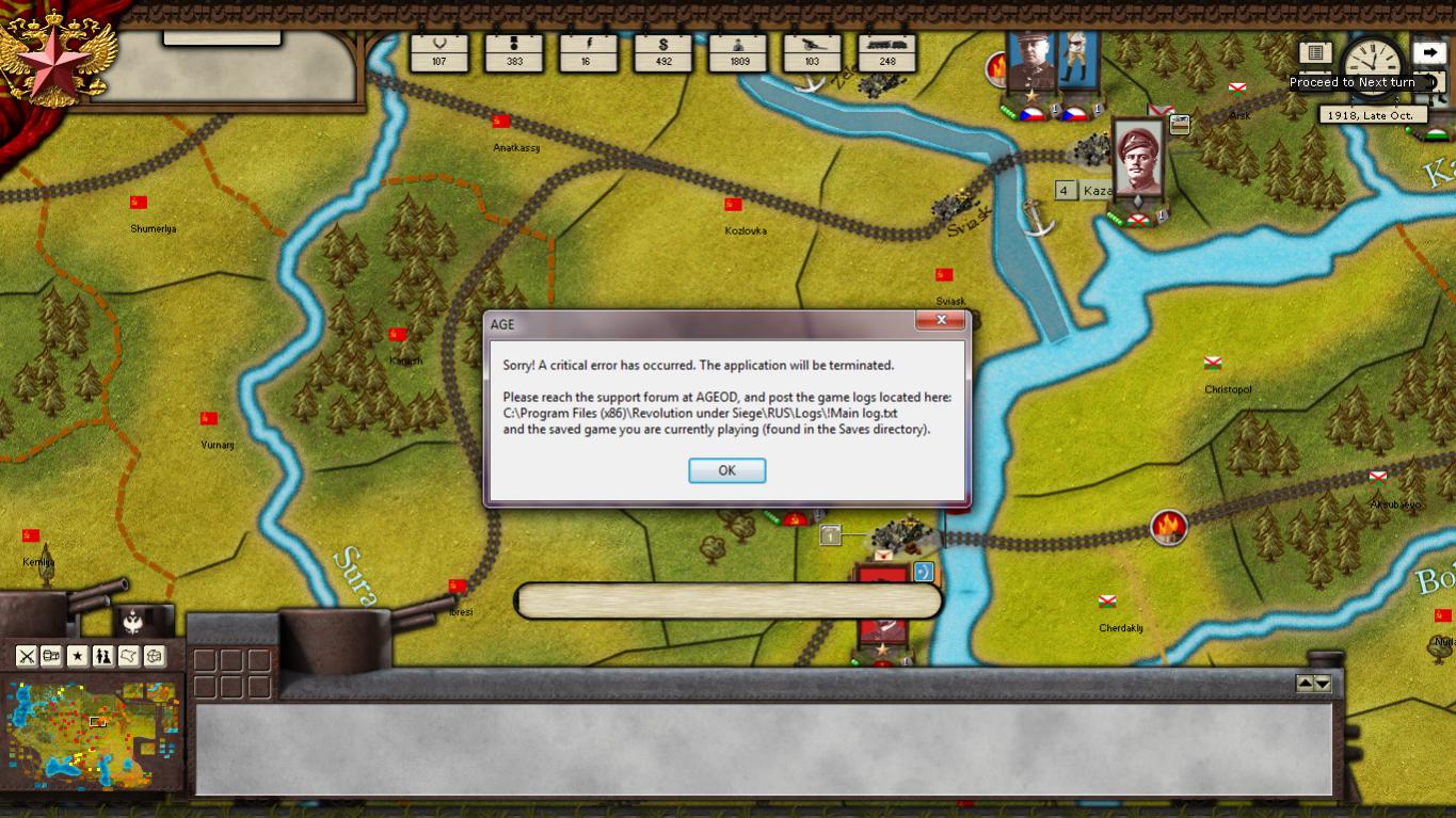 Bonjour, nous sommes actuellement en pebm a 3 joueurs, je suis le hosteur et je rencontre un crash du jeu lorsque j'essaye de passer le tour suivant (le tour 10). J'ai déja essayé le backup du tour précédent sans succès, le crash est toujours la. J'ai joint une image du message avec les logs. J'espère une réponse rapide ainsi qu'une solution pour que nous puissions continuer notre pebm . C'est vraiment décevant de voir de pareils bugs si longtemps après la sortie du jeu et avec un jeu patché , nous avions déja eu un bug des armées russes sur Rise of Prussia.