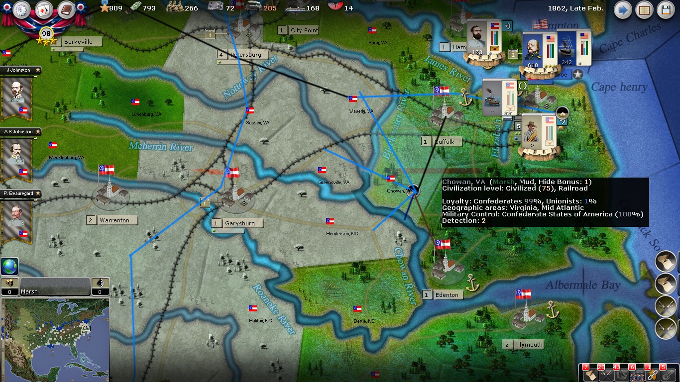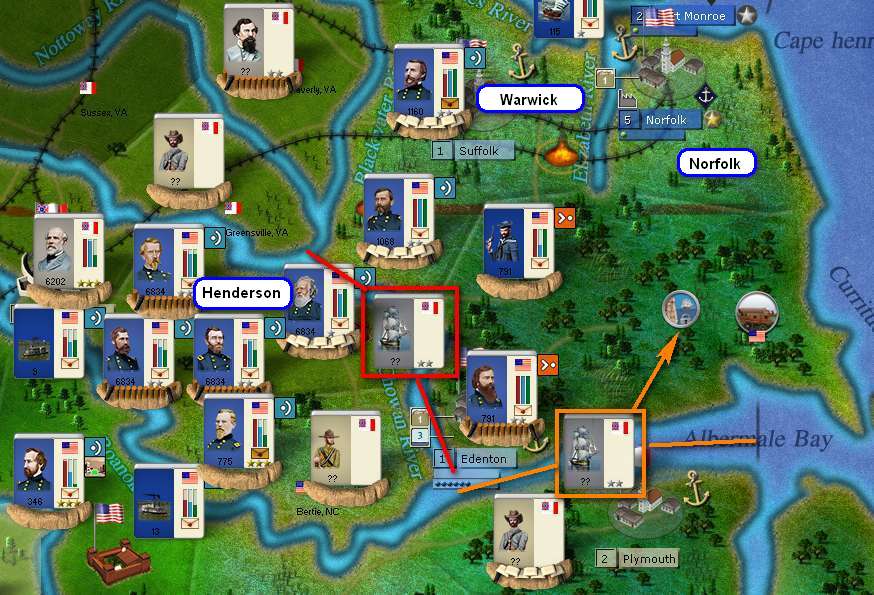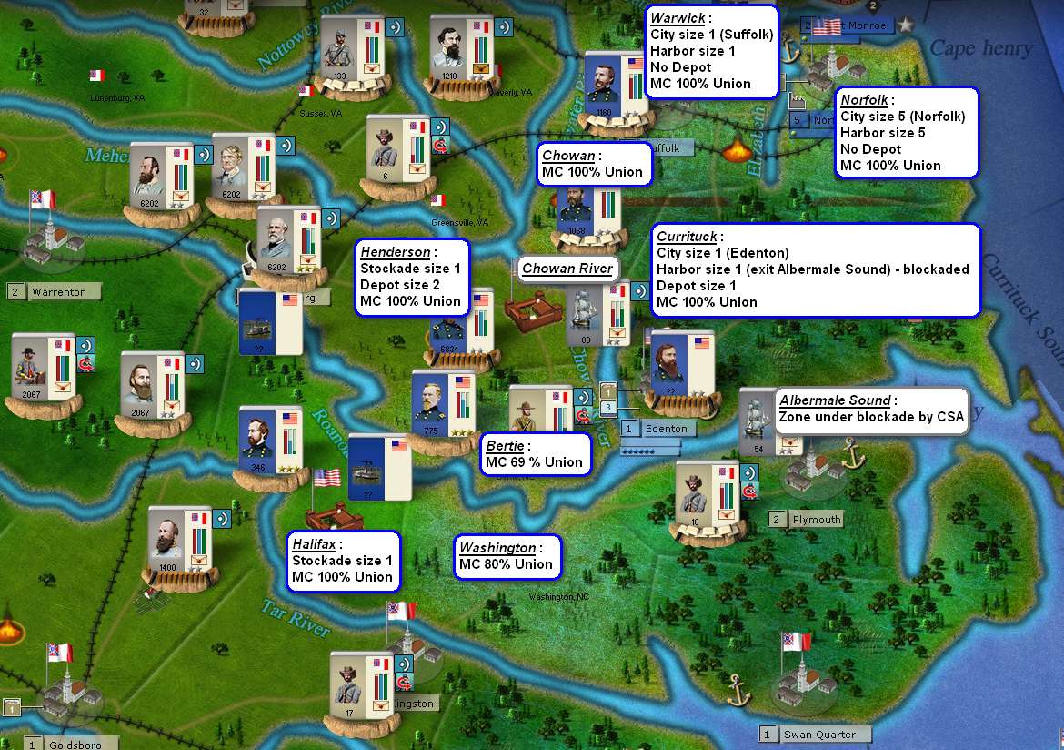 Note : because of the fleet in the Chowan River, there is a 90% chance to block Union movement and, as explained by Pocus, to block supply movement.