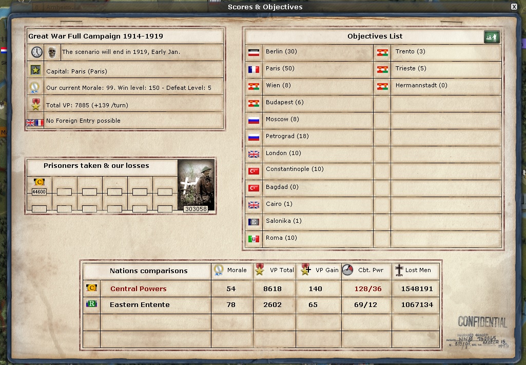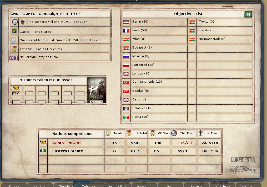 And here is the objectives screen. The CP have lost 2.3 million men. The Entente together have lost about 2.1 million men. the CP NM is 45 and mine is 94. EE is 71!!! That is not good, but not much I can do about it. My VP/turn moves back and forth from 140 to 139 constantly.