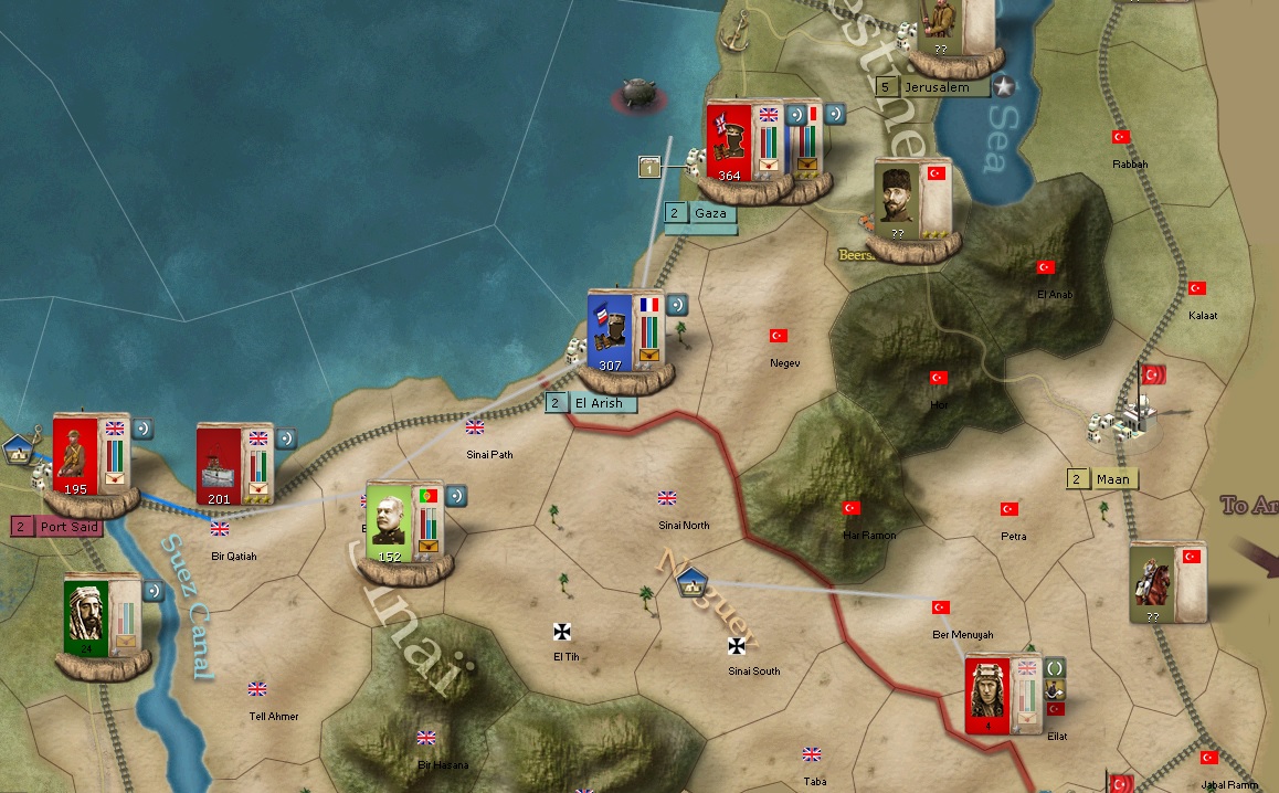 In the Egypt theater, it looks like the Turks are withdrawing somewhat. They are certainly not pressing the issue and I have basically an unbroken line covering all advances South/SouthWest into Egypt. I'm wondering if I should pull a historical move and go SE to Aqaba on the Gulf of Aqaba.