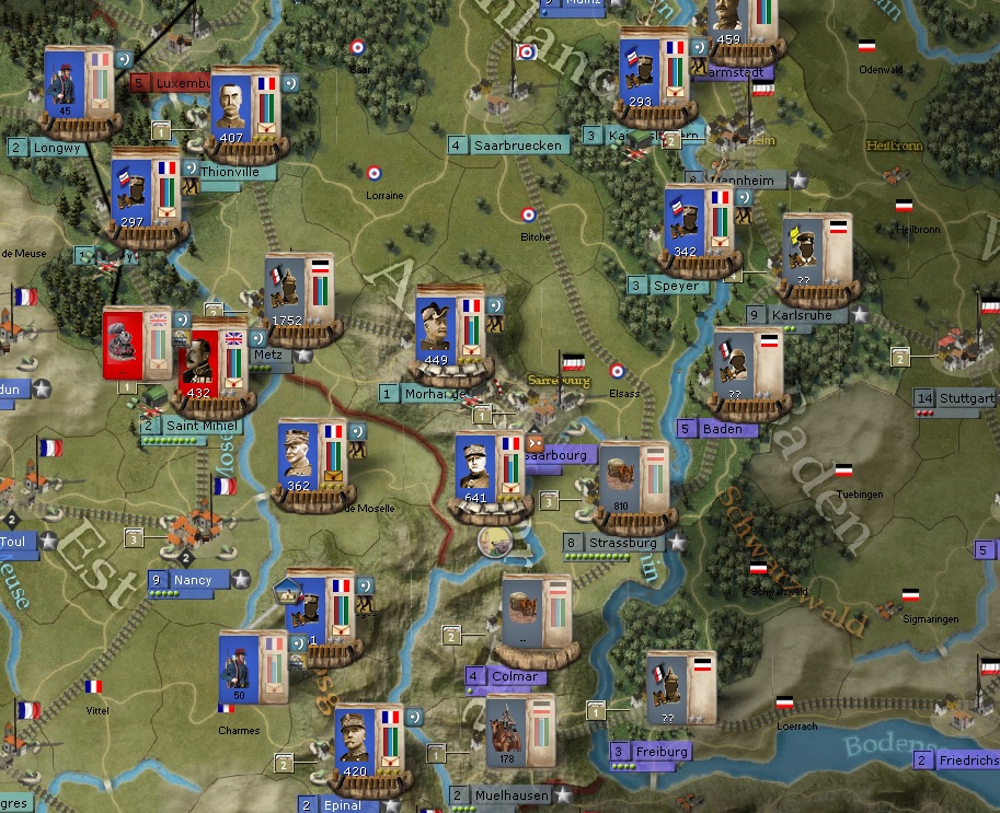 And I am going to move Castelnau SE and try and take Saarbourg. The only formation that could truly threaten Morhange is the 1700+ formation in Metz, and I don't think he's abandoning Metz any time soon. If he did, I would feel like that was a mistake giving up the fortification/entrenchment at the Fort of Metz, so yeah, he'll probably stay put.
