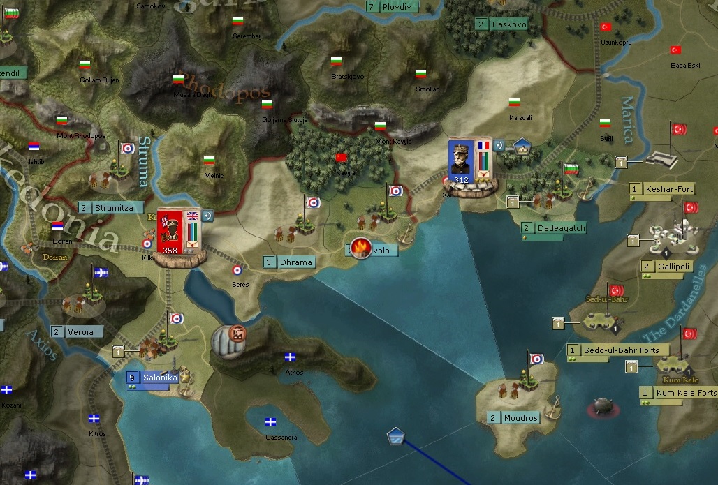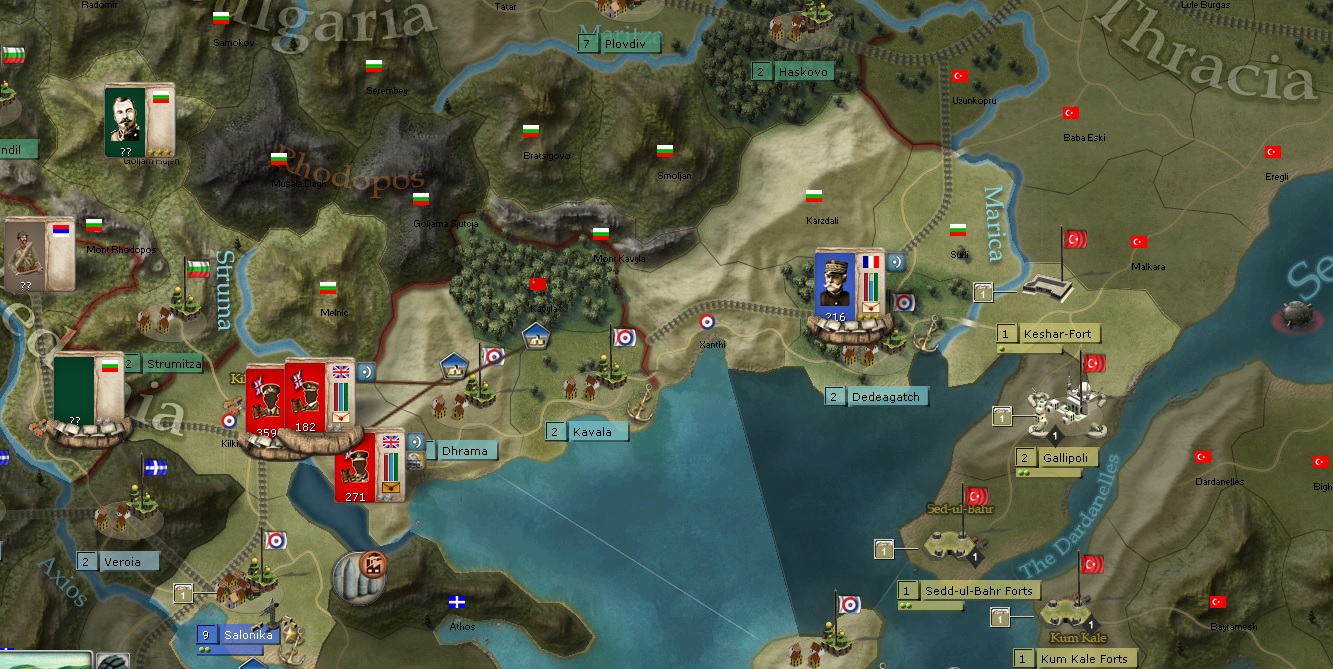 And then I am using naval transport to transfer a corps of British troops to the Salonika region. It almost seems uncontested there. The corps consists of 3 infantry divisions and 1 tanks corps. They will be commanded by a nondescript 999 general named J. Gellibrand.