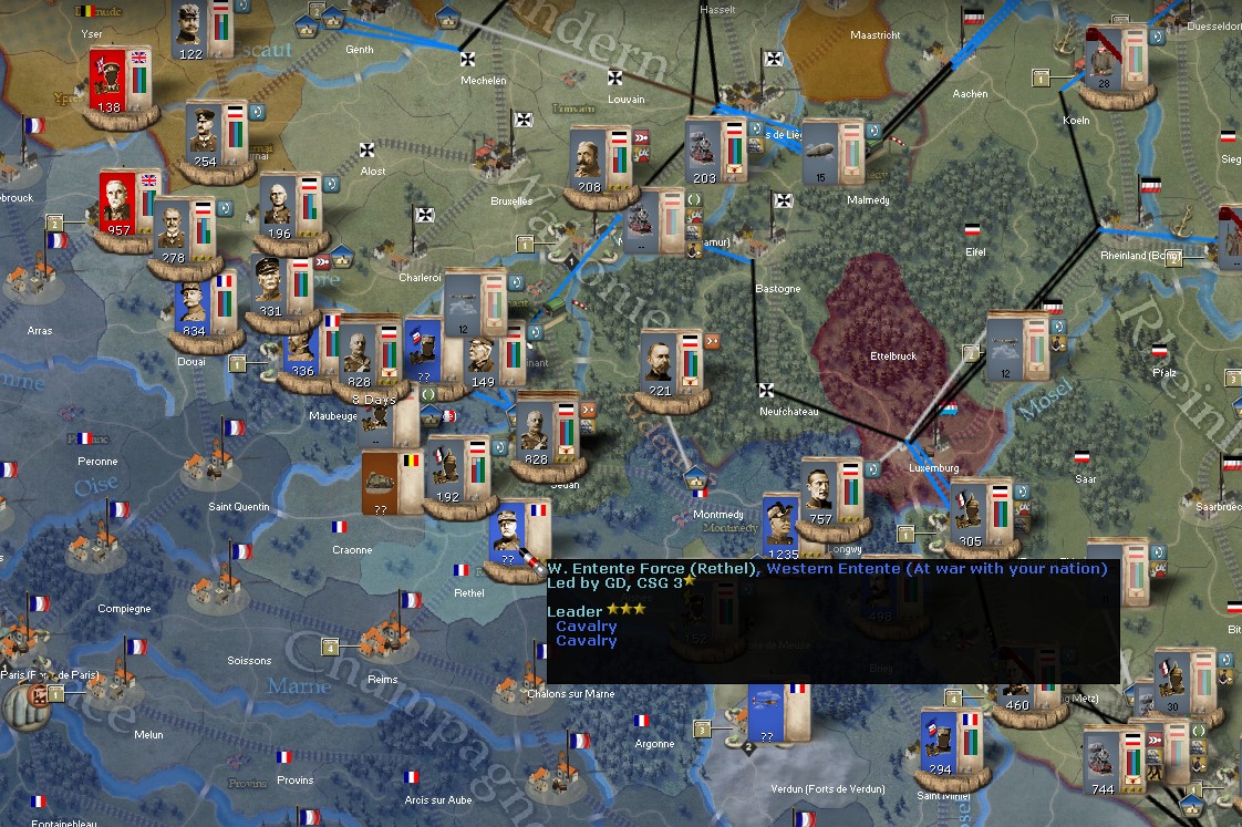 In the meantime, HerrDann opted not to assault Liege and Namur fortresses hoping for a surrender and NM boost. Kluck captured Brussels and is poised to attack Liege, Schlieffen plan objective. I consider this plan too risky, as BEF is undetected and in the area, and rail connections to Liege are still open for the French to bring reinforcements, something human player would surely do, but being a junior ally I am not to meddle in Germany plans. Herr Dann also planned attack in Longwy, rather unexpected and risky, but it might bring success if WE concentrates soley on Belgium.