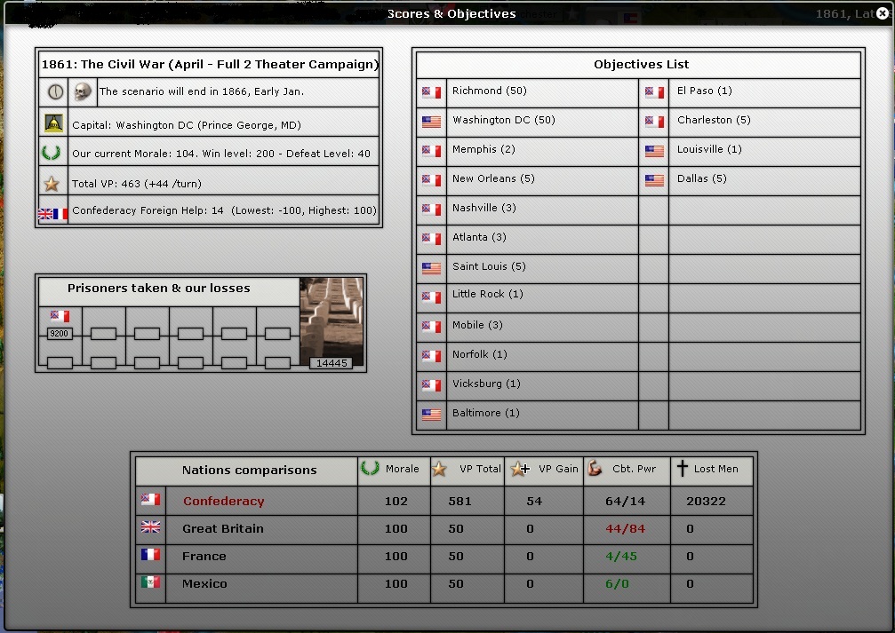 The next round will play the April 61 campaign through Early July 1863 (final score will be the score shown at the start of Late July 1863, turn 56).
