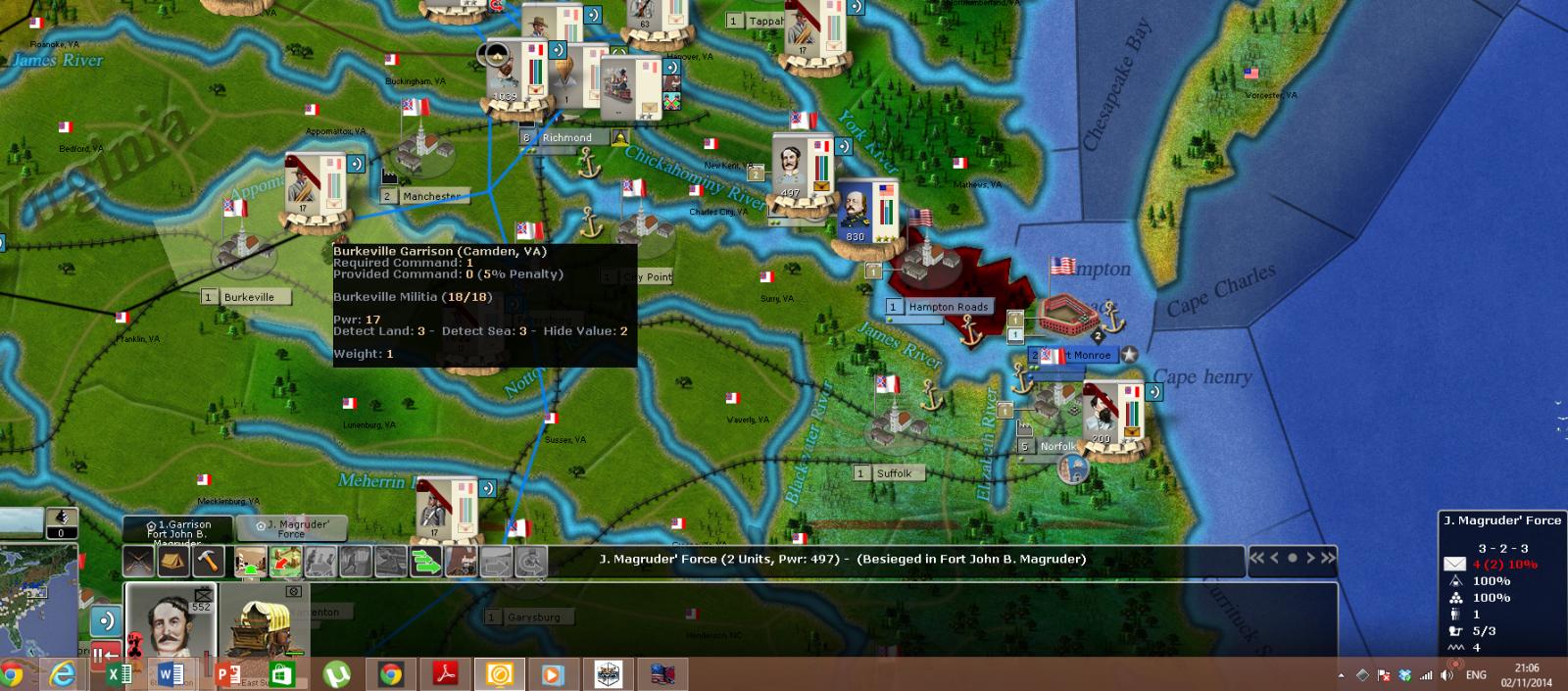 Thank you to Ace and Captain Orso for a very thorough detailed analysis. I never leave troops inside cities because they are traps. However, I was under the mistaken impression that a fort would give me better protection... or at least prolong the siege until I could lift it. The lesson I have learned here is to NEVER leave a force inside any structure. If Magruder had been entrenched outside I think he could have defended very well against this attack by Butler. I was just shocked because I have never had a surrender happen to me before. The Union now has a fort only 2 regions away from Richmond... a dagger at my throat, plus I have lost a good size force and taken the NM and VP hits. I don't think forts or redoubts are worth the effort (maybe on rivers to let artillery fire on ships)... entrenching is free and a lot less risky.