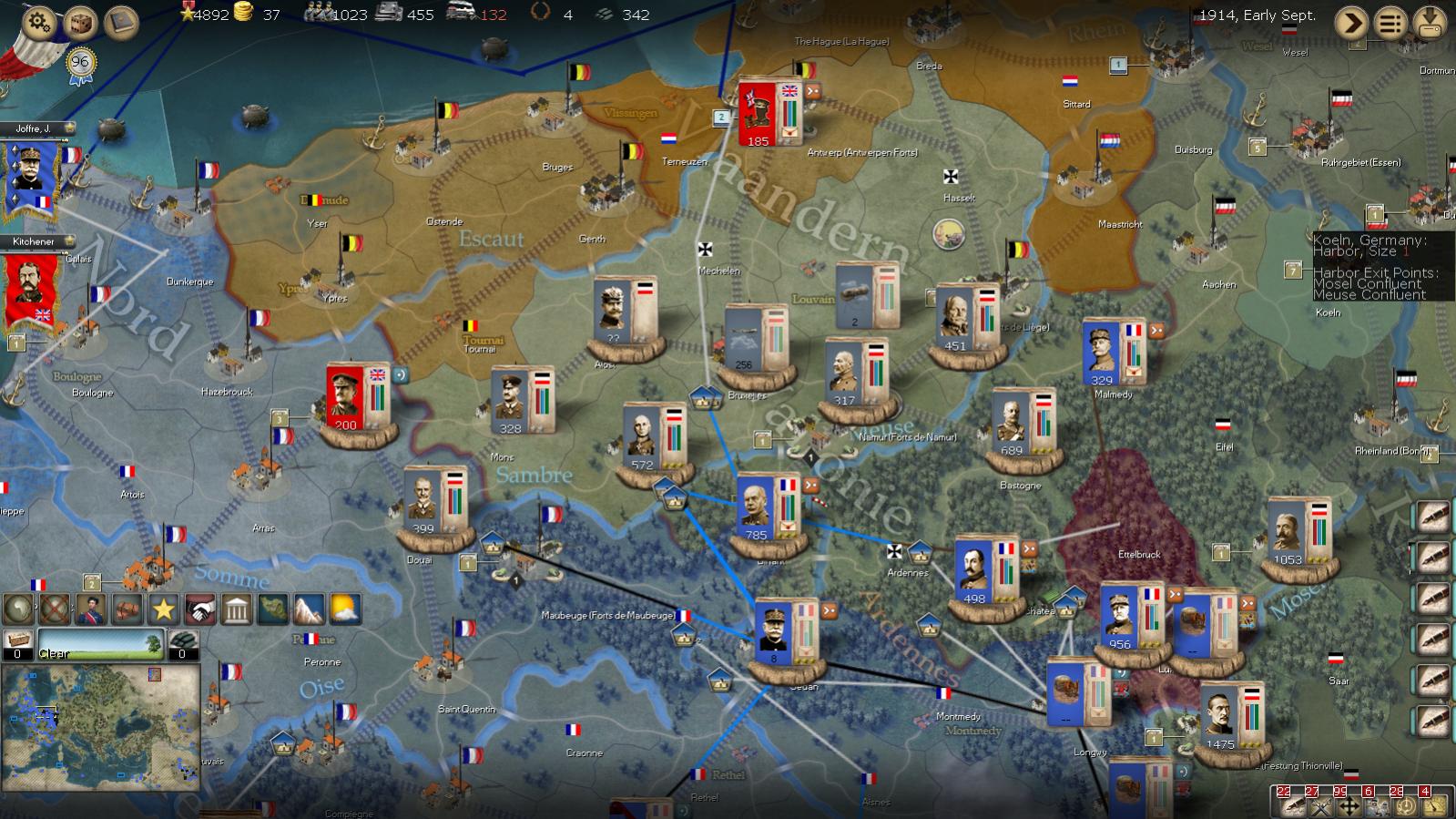 Now I am taking a gamble, I believe the last before I settle down for drawing my battle lines along the ORANGE line. That will be, the attack on Brussels. The combined armies of the British from Amsterdam, and the French Quatrieme Armee, will attempt the final breakthrough into Brussels. This position would not only remove the only depot in German control in Belgium, but would also cut their invasion force in half. I predict the battle may result in a defeat. But if it succeeds the rewards will be great, if it fails...., then we must give up on Belgium. If we give up on Belgium, we fall back to positions behind the Orange Battle line, Behind the Somme and the Sambre Rivers, and the Ardennes.
