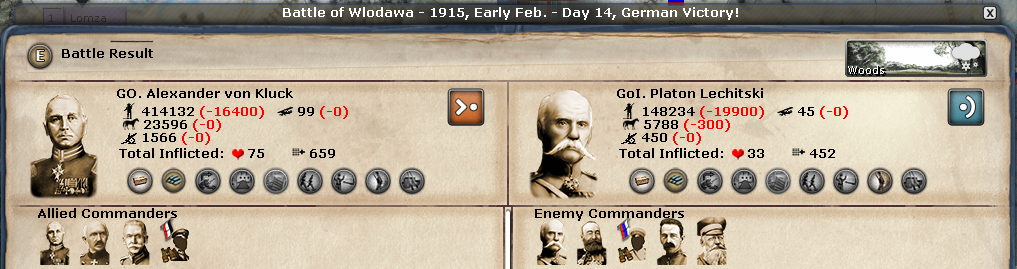 First a look at how things developed outside of Brest Litovsk. The Russian 2nd army attempted a break out from its ongoing encirclement in the direction of Brest Litovsk. This resulted in two battles in Biala and Brest Litovsk with the 2nd army.. which was forced back on Biala.The mystery is that after the dust settled the 6th army under Brusilov is now also in Biala. The turn began with Brusilov in Wladawa needing to gain military control... this should have triggered an automatic battle with my two armies in the same region. According to the manual a force with zero military control in a region will auto switch to offensive posture to gain MC... just another strange result from the enigmatic game mechanics. Anyway, the end result looks very promising with both the 2nd and 6th armies now cut off and surrounded in Biala. The 29th Corps escaped and fell back to the east at Kowel.