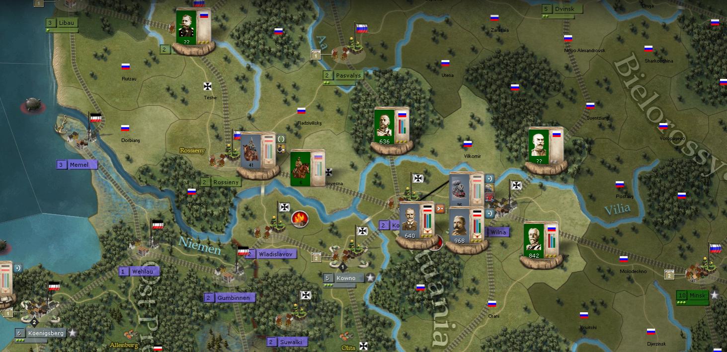 So this is the situation as it stands in the far north. I moved Von Hausen up by rail to protect Wilna while I sent Von Quast west to deal with Samsanov. I may need to send further reinforcements as Rennenkampf moves further south and my cavalry fall back... winning a skirmish with some Russian cavalry. Wilna has Russian armies to the north and east.. potentially four Russian armies converging on my two armies here..