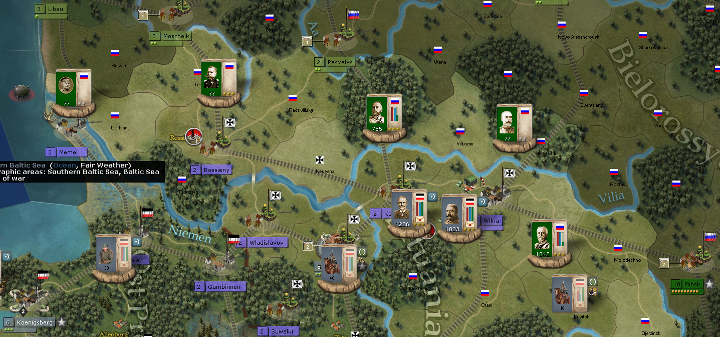 Brusilov leads his defeated army west in an attempt to break out and get resupplied. The Russian corps near Brest Litovsk retreats north and perhaps most surprising of all the Russian army occupying the key rail hub at Kowel appears to have moved north. He could be moving armies north to attack me in Wilna/Kowno or Prussia... or he could be planning to block my advance northwards to Minsk. I must take care to guard my flanks while sending out scouts to locate the elusive Russian armies...