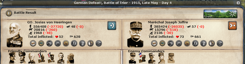 The reasons for this have already been commented on... suffice it to say again that the game fails to represent the type of warfare on the western front IRL where the power was with the defence. Instead the offensive capabilities of armies at this time are over estimated and the result is a kind of to and fro boxing match with the front line shifting anywhere from 50 to 100 miles each turn. One aspect of this power lying with the attacker is in the ratings of the generals. All of the generals on each side tend to have much higher offensive than defensive ratings. While I know that the tactical training at the time stressed offensive over defensive warfare the fact is that the technology of the industrial age placed the power firmly in the hands of the defenders in most cases. Major breakthroughs in 1915 IRL gained at most 2 to 5 miles of ground... not the 50 to 100 miles we are seeing in the game. What should be happening is military control shifting within one region from say 10% to 30%... which if maintained over several turns would result in a shift of one region. Instead, in the game I was able to advance two regions last turn by blowing a hole through the French armies... the following turn the French have advanced two regions by pushing back three of my armies about 75 miles. Sorry, but it just didn't happen this way. Feels like ageod rushed this game out in time for the 100th anniversary of WW1 without thoroughly testing the western front game play. While it may be exciting to see these dramatic shifts being played out... Trench warfare it is NOT...