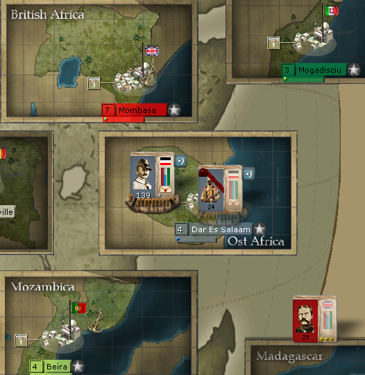 In Africa I have to stop Von Lettow's march north because he was taking so many cohesion and attrition hits. I'm glad I recalled him as the Brits have appeared off the coast...