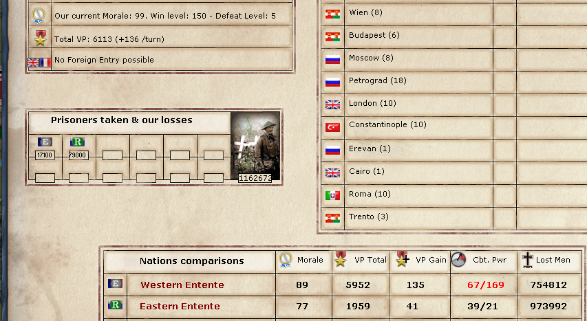 While giving the Russians a temporary morale boost (they sit at 77 currently) once I can drive the Russian morale back below 75 again they will suffer an increase in rebel activity on the home front. This can lead to Russia eventually leaving the war .. as IRL. This is a very encouraging development and demonstrates that my overall strategy is working... it also means that I must keep the pressure on the Russians and inflict more morale destroying losses on them... here is a summary of how the war is going on the objectives screen.. Trento in Northern Italy (currently under siege by the Entente) is a major objective. I must do more to relieve this siege soon...