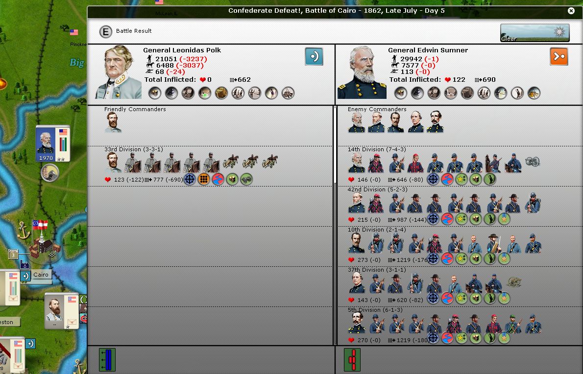 This one is more of a mess because a Union corps commander gets killed, thus the two battles. Notice how both Forney and Polk are properly savaged, but ASJ only loses some cohesion and a mere handful of hits.