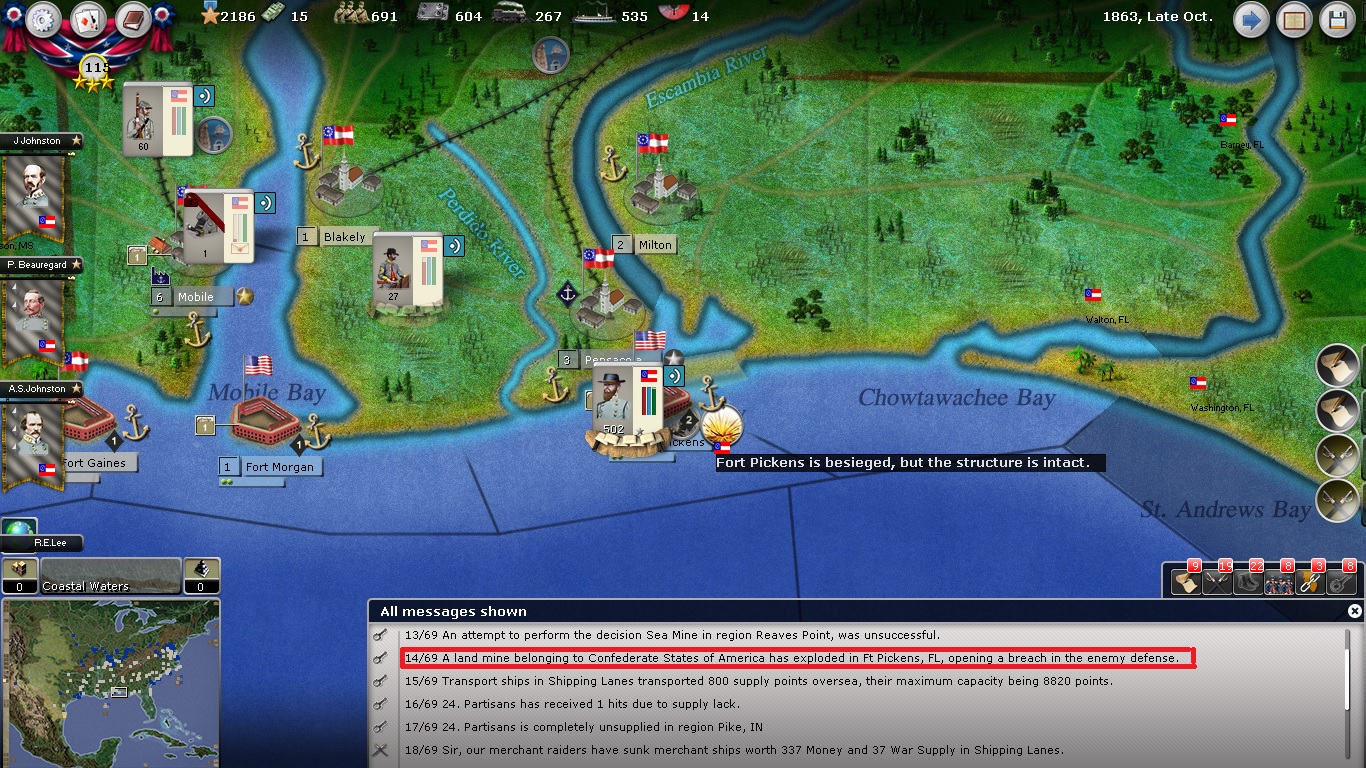 Thanks Captain_Orso. Is that certain? Interesting that the coastal waters cannot be interdicted by entrenched artillery considering that the forts will interdict the naval supply by blockading the city. I now notice that there are actually two regions through which Fort Pickens can receive supply, so I will try bring artillery to the second region as well.