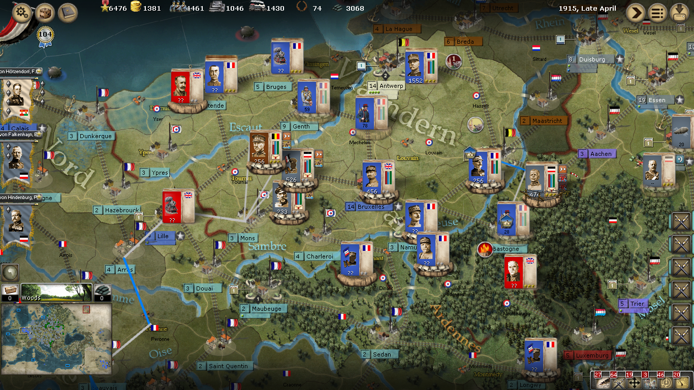 The Belgian front has progressed as follows-(Including fortresses) 800+ power stacks in Antwerp-Leuven-Liege-Bastogne, the French readied themselves for a big push with a 1700 stack and pushed my forces out of Leuven (Which oddly enough took barely any casualties), and then out of Hasselt and Liege (Also with barely any casualties). I then prepared a break out of Antwerp with the two German armies against the cohesionless stack at Hasselt, supported by the two armies at Liege (One of which was forced to withdraw from Bastogne by a single French army corps, again without loss)