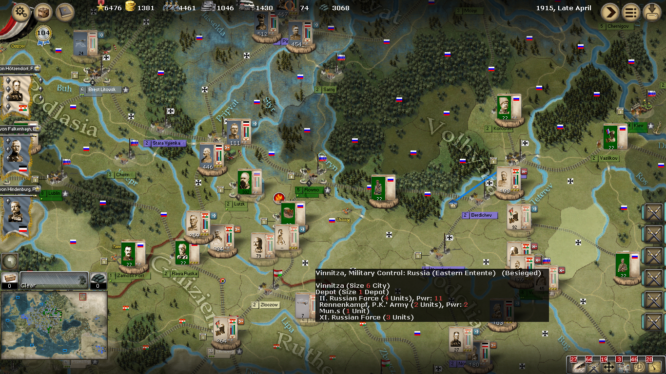In the East Vinnitsia witnessed an inspired defence, but is about to fall-last round only 3000 infantry and the artillery firing at point-blank range managed to hold the final onslaught, but now I suppose even they have run out of ammunition. With the Winter behind us and the ground hardening-1915 looks set to hold great things in Ukraine. Oh and two newly formed corps and the Cavalry Army are pushing into Bessarabia as we speak, although the Vinnitsia forces will probably cut them off near the border anyhow.