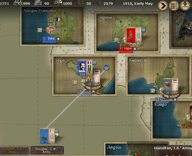 Oddly, for me, the distant unload seems to have worked fine. I took the file you uploaded, and ran the turn. Humbart and his 2 corps are now in Togo, and the ships are still in the Atlantic. The troops distant unloaded from the Atlantic, and so made it. It takes 84 days now to move back from Togo to Africa Franciase.