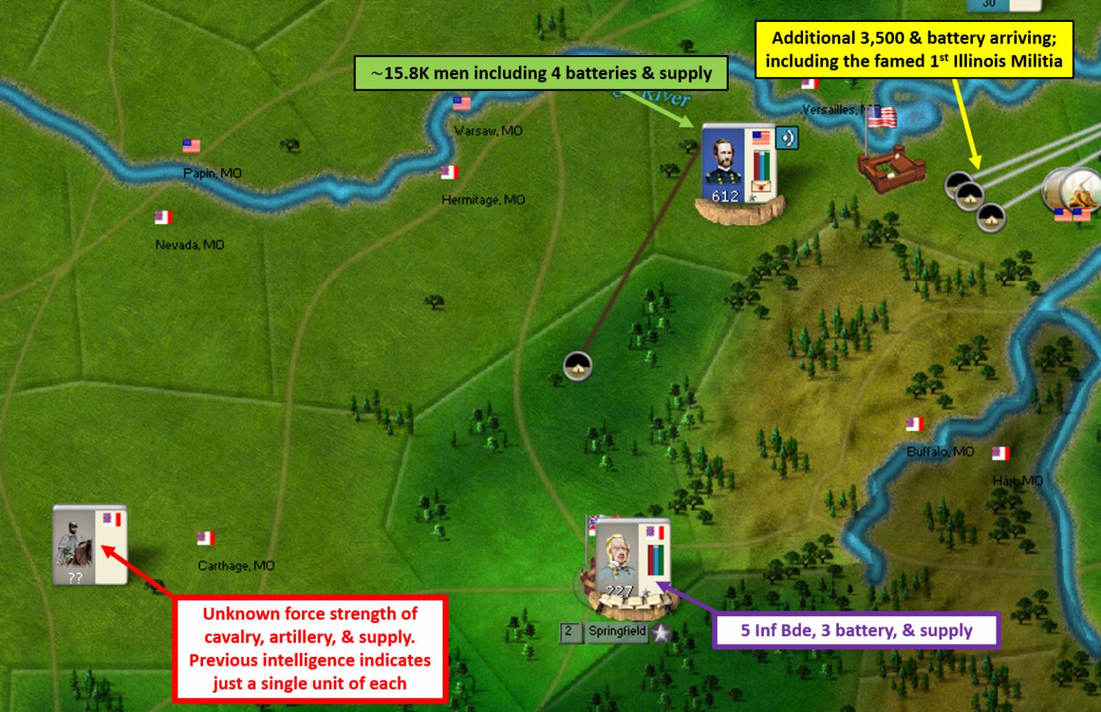 [color="#008080"]TRANS-MISSISSIPPI:[/color] General Lyon and his overwhelming forces were able to capture Springfield after a short stiff fight. This removes all the Missouri forces from Arrow’s force pool, hopefully for the rest of the game. I don’t think he was able to recruit too many of those forces either before he was pushed out. Additionally, with Springfield in my hands, it’ll be harder for CSA raiders to go after northern Missouri targets. After the battle with McCullough, Lyon's stack easily overwhelmed the militia garrison to add to Arrow's losses this turn.