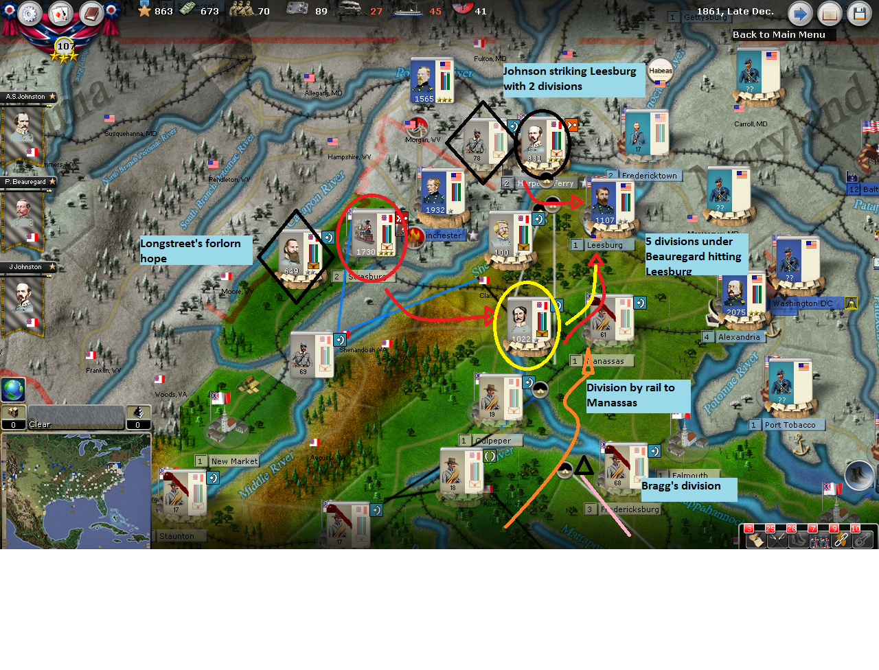 The sea coast down to Wilmington will be protected by spinning off a reaction force from the Army of N VA. And, as the Southern rail system tends to break in your hand when you need it most. I plan on developing strong, holding forces at New Orleans, Mobile and Charlestown.