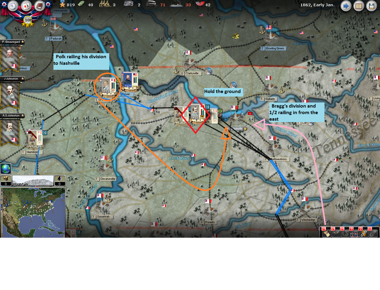 The Army of the Tennessee in Mississippi is gathering at Madison, TN. Bragg is already on site with 345 pwr on Blue/Orange; AJ and the army is coming in on Blue/Orange with 427 pwr; Forney is railing in on Blue/Orange with 446 pwr. Together, they’ll try driving the Federal division out of Madison and pushing north to cut supply routes and roll back the blue bellies. The Mississippi River fleet is steaming to block the Cumberland River. If Kentucky doesn’t come in and open up a new open land supply route, Grant could find army without crackers and ammo.