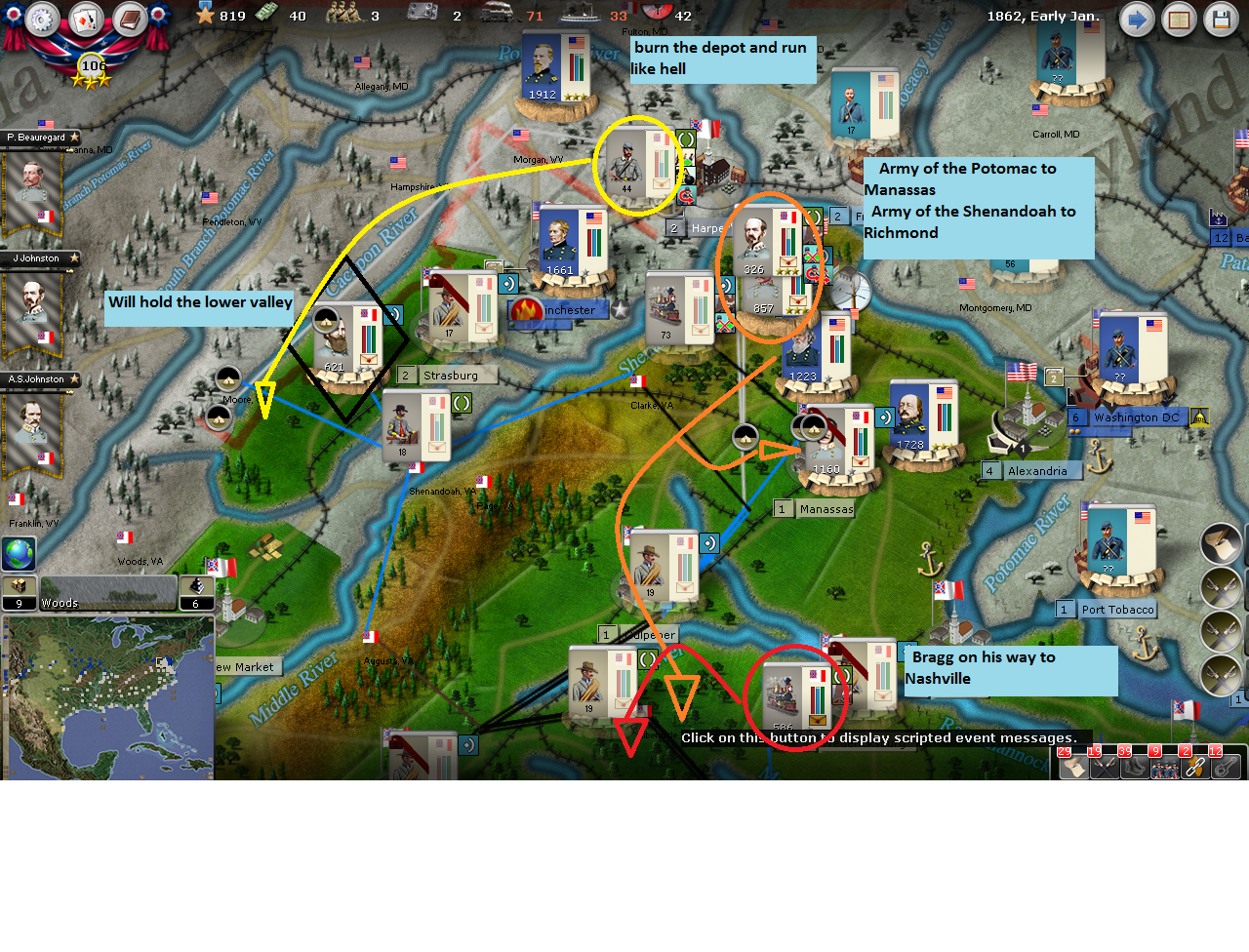 In the west, I will build and gather enough cannon and supply units to run up and construct a fort at Paducah. I also need a force strong enough to grab and hold Bowling Green while still sitting on Nashville. I’m going to try and drain the KY force pool and then fight every step of the way back to Chattanooga.