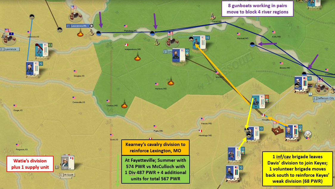 Kearney will take his cavalry division to Lexington, MO as I don’t really have much strength in that area. Some additional gunboats have finished building and I am sending 8 gunboat units to patrol four sections of the Missouri River. Lastly, a really tiny division guarding Lawrence will head north as they won’t me more than road kill to Watie’s division.