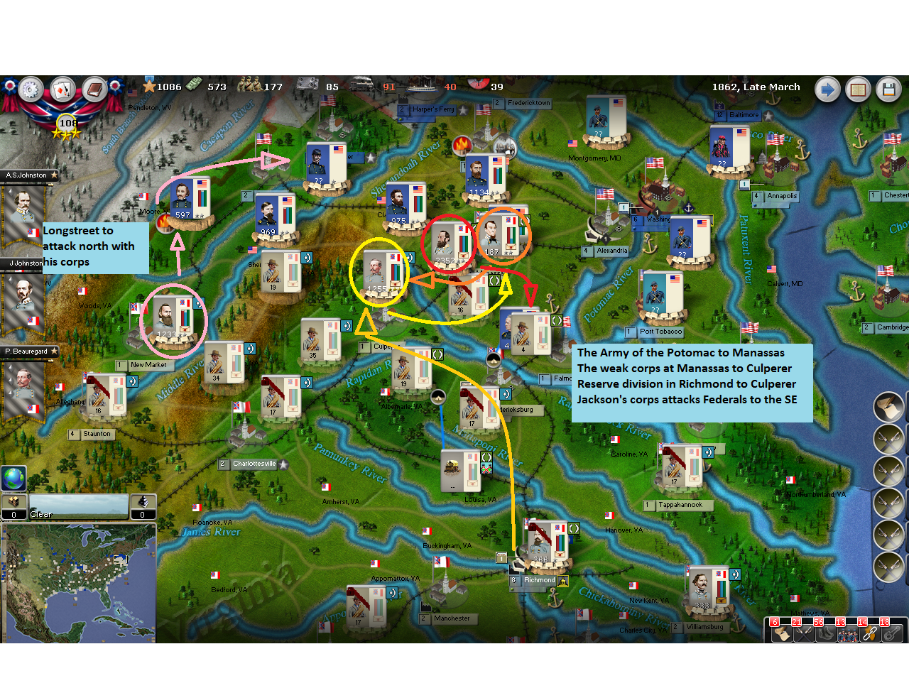 For Late March, I shifted the Army of the Potomac to Manassas, moved a weak corps from there containing a beat up division to Culpeper. A strong, reserve division from Richmond is railing to Culpeper to help hold the ground.