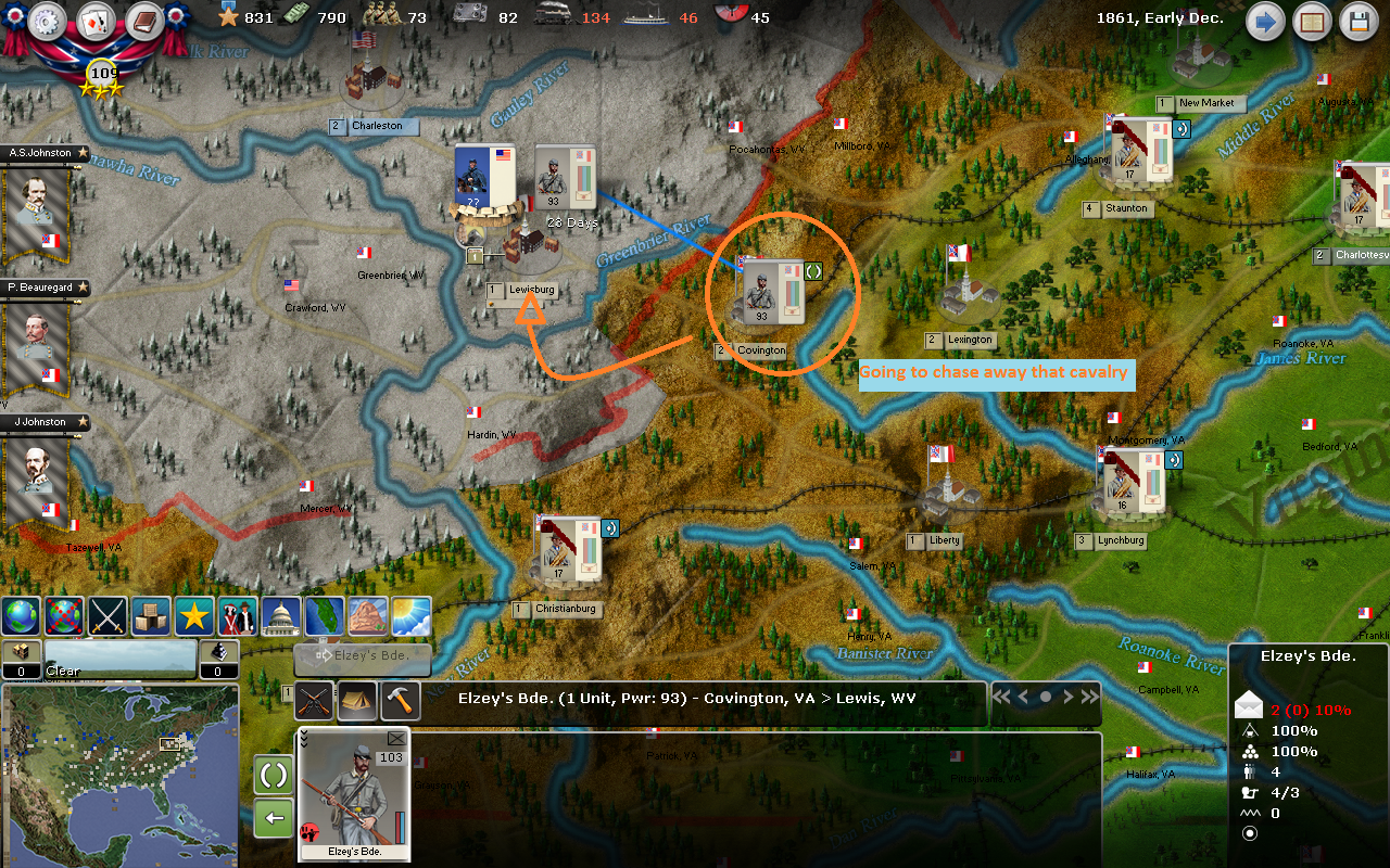 In the West, I have a 2 division army ready to run up to Bowling Green. One of the divisions is a weak cavalry formation. I’ll try to gather all the low hanging fruit, dig in and drain the KY force pool as much as possible.