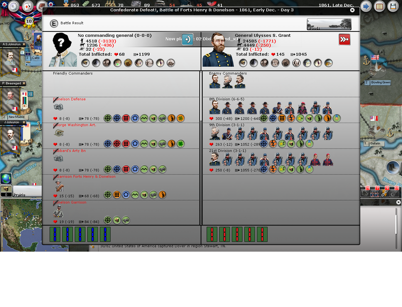 The sea coast down to Wilmington will be protected by spinning off a reaction force from the Army of N VA. And, as the Southern rail system tends to break in your hand when you need it most. I plan on developing strong, holding forces at New Orleans, Mobile and Charlestown.