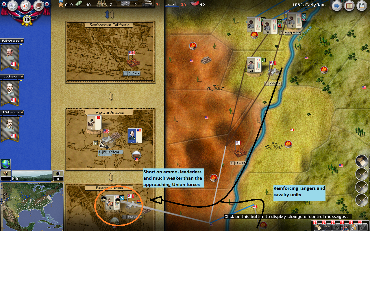 In the west, I will build and gather enough cannon and supply units to run up and construct a fort at Paducah. I also need a force strong enough to grab and hold Bowling Green while still sitting on Nashville. I’m going to try and drain the KY force pool and then fight every step of the way back to Chattanooga.