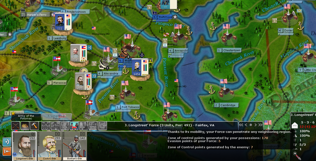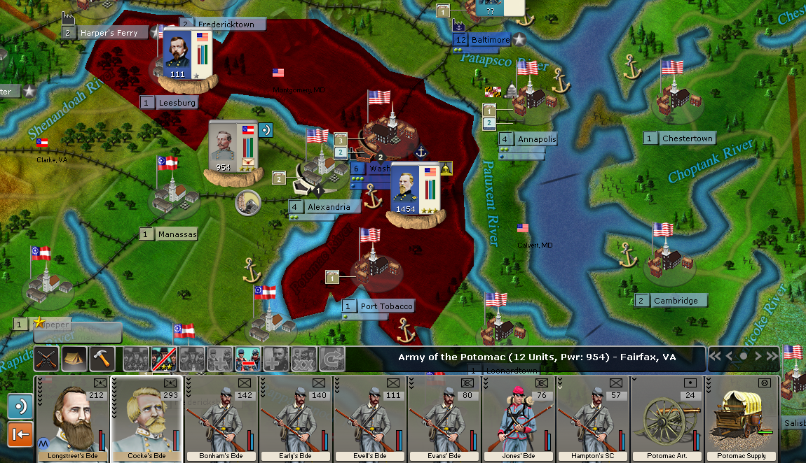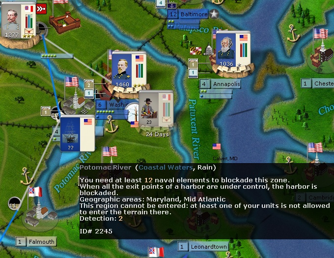 A Brig unit with two ship elements placed in the river area between Alexandria and D.C. (called the Potomac river) stops all direct Confederate movement over the coastal water areas of the entire length of the Potomac. P.S., I had the brigs set to Blue/Green.