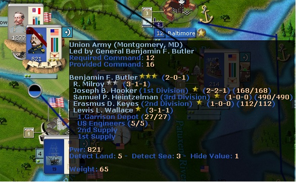 To defend against this, I have constructed a stockade in Montgomery, MD and Butler has an entrenched army of two Divisions of infantry (one understrength) and a Division of artillery with a few batteries. The stockade allows 25 elements before overcrowding, hence dictating the small size of the force.