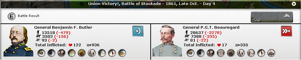 Grant becomes available in October '61. I immediately rail him over to Baltimore and give him command of an elite infantry Division equipped with a Marine element. He then assaults Fort Clark off the coast of NC. This coastal fort is an actual island for game purposes and cannot be easily reinforced by the CSA player.