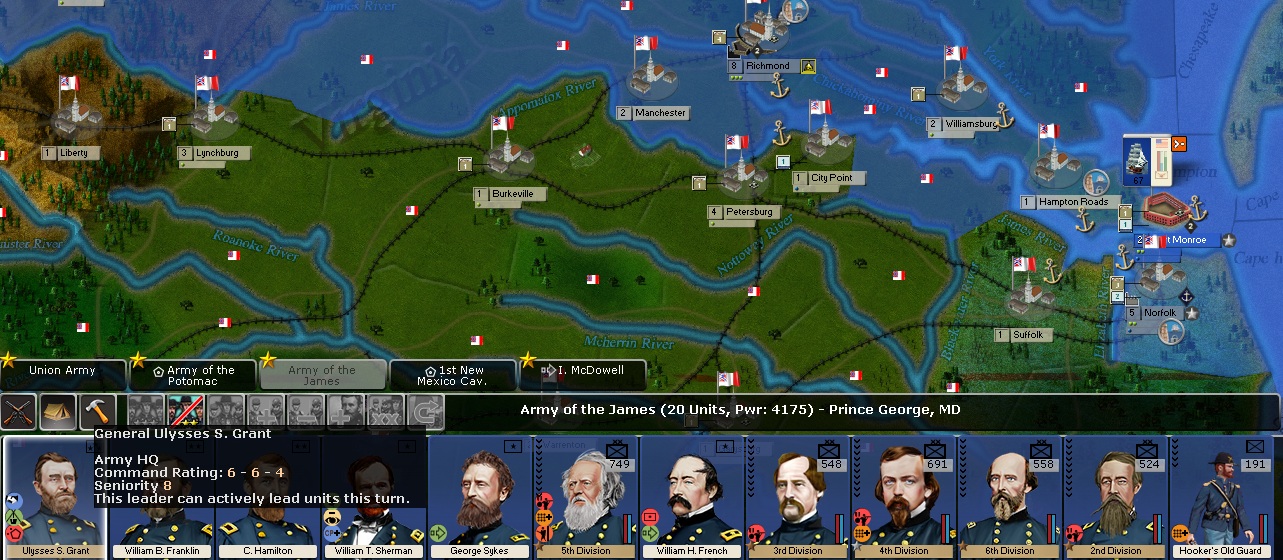 I have a pic indicating that Grant's command radius from Prince George allows him to positively influence Corps commanders as far south as Norfolk. So Grant can defend Washington, threaten Northern VA and make Kearny/Rosecrans into even better Corps Commanders in his army as they take Williamsburg and march up the peninsula on Richmond.