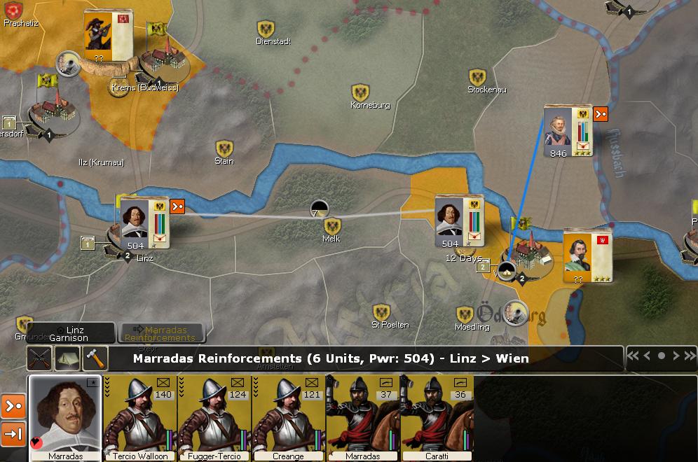AI can have problems crossing large rivers and returning back. Placing 2 cavalry detachments in Budweiss and Ilz can lock movement with enough ZOC when Bohemians decides to move Linz.