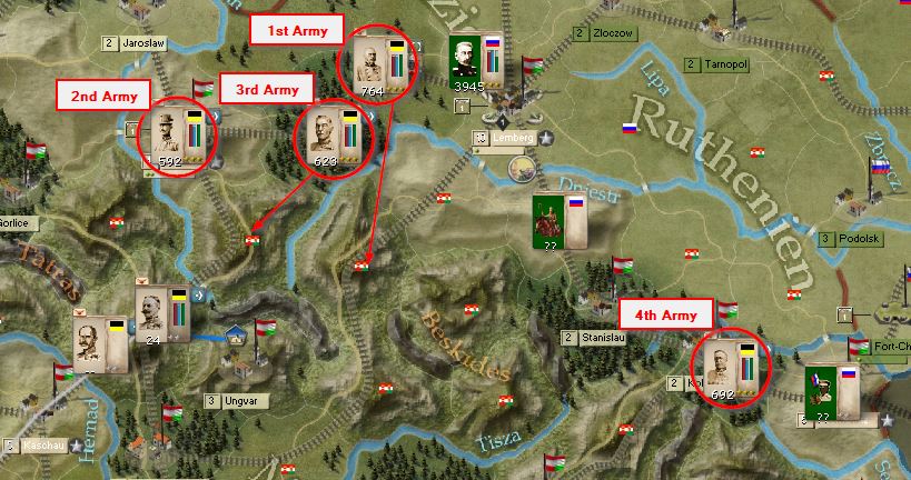 And here's the situation against Russia. He's consolidated 3 or 4 Armies on Lemberg. I have no idea what the Russian starting forces are in this game or how powerful they begin with, so I have no idea where everything is. I moved 3 Armies in and around Lemberg in the hopes he would attack quickly. He didn't. I tried to extricate them, as I simply don't have the firepower for a pitched battle yet. 1st Army lost around 14k to his 4k but was able to retreat. The next line of defense is the mountains southwest of Lemberg and southeast of Przesmyl. The 4th Army could take a swipe at a Russian Corp in Czernowitz, but there's still at least 1 Russian Army unaccounted for and this could be a trap, so I've decided to hold with them.