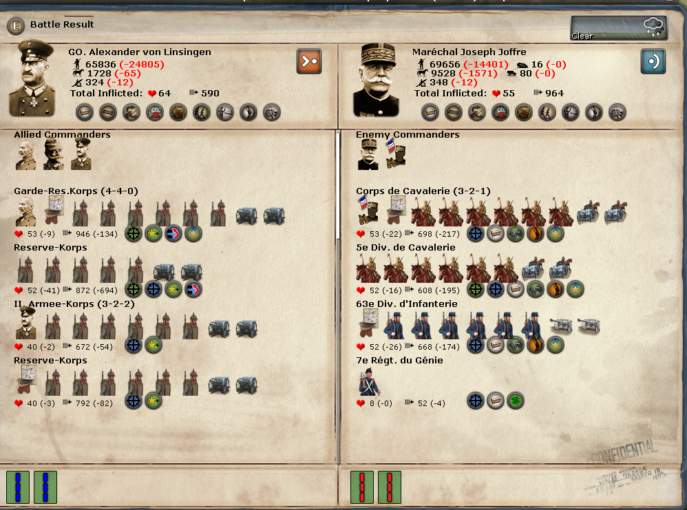 One thing I have to make a remark on - retreating forces are taking way to few losses - many times I attack none dug in and retreating forces - but the losses are often equal - that is why I had to stop the Hindenburg offense in the East - I won every battle, but we had equal losses - my leader and CB far superior at times - my opponent had due to low cohesion only 300CB while I had 1000 - he was not dug in and we take the same losses - really? So I had one Phyrrhic victory after the other - the same in France - look at the losses screen shot - should it really look like this if I win 95%+ of the battles and force the armies into retreat? If they would not retreat ok - but like this it just feels broken and makes it much harder for the CP that needs to go on the offense. How do these units escape so fast??? Usually a retreating force took major losse due to the retreat and being chased down by the attacking force...that is really off - also in Vanilla but maybe Altaris could balance it more as well? ;-D